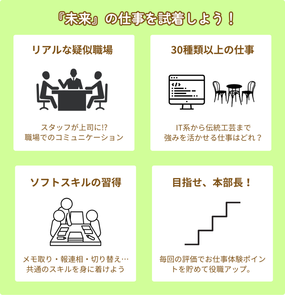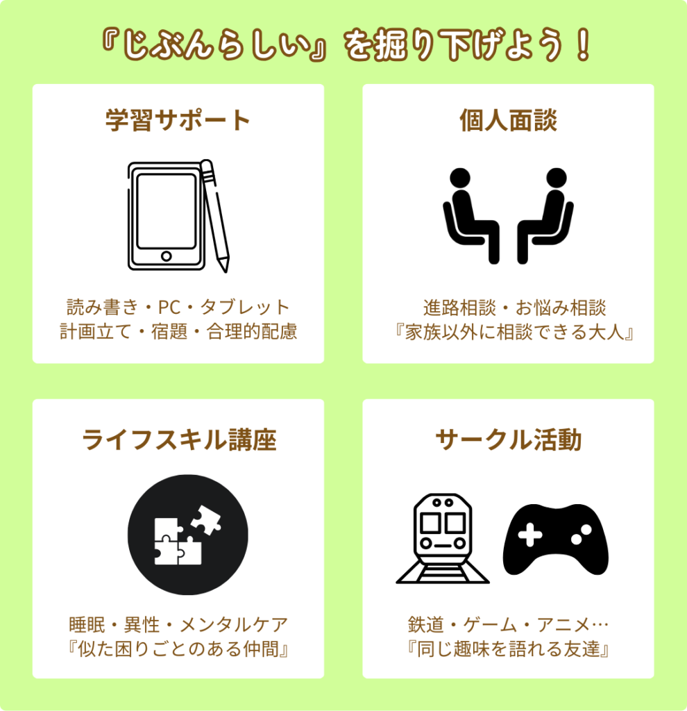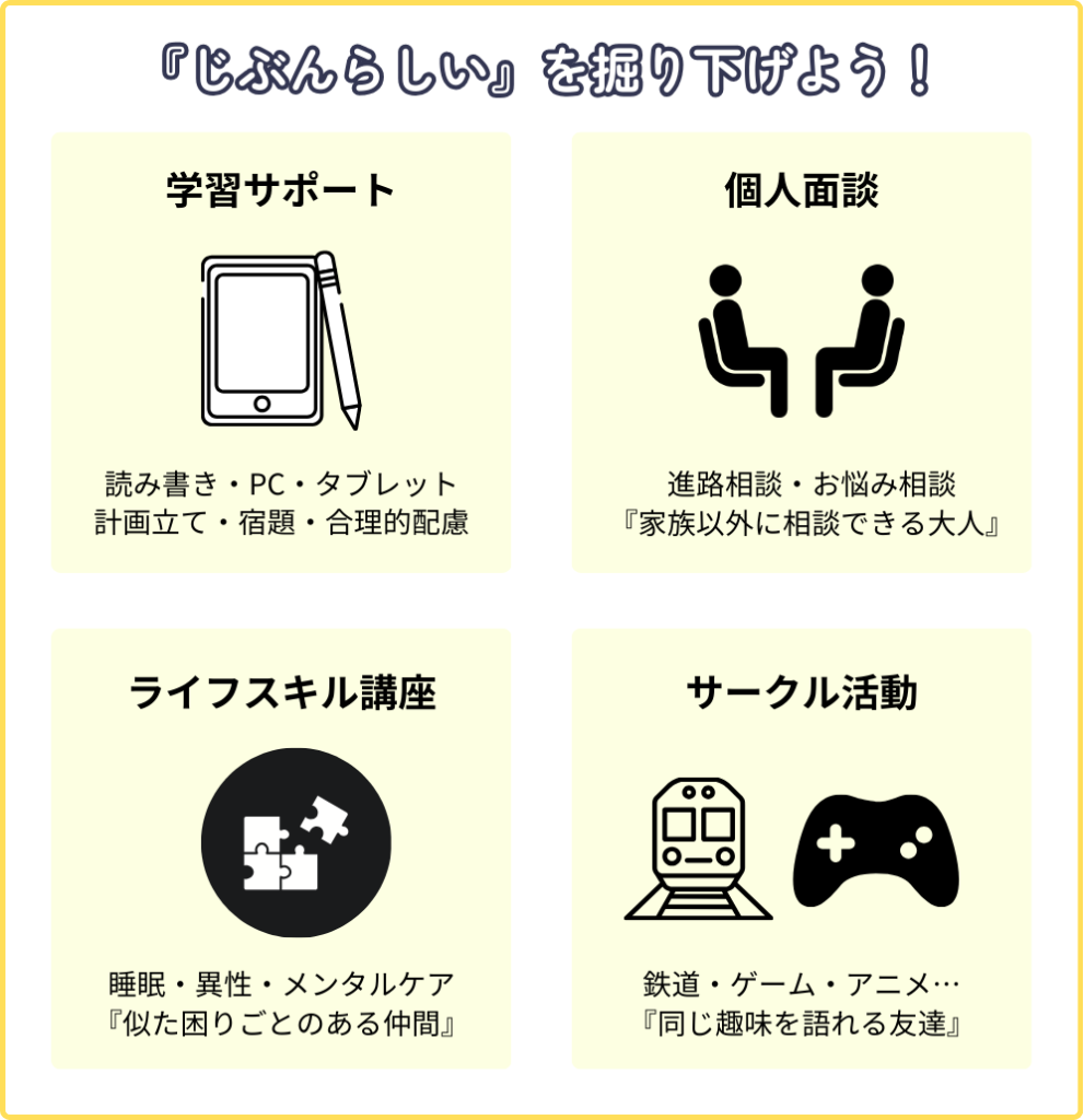 将来の就職や自立に向けて、前向きに自己理解を深め、自分にあう進路を選択できるように専門的なスタッフが伴走します。