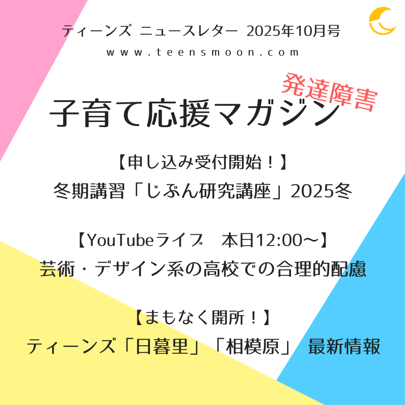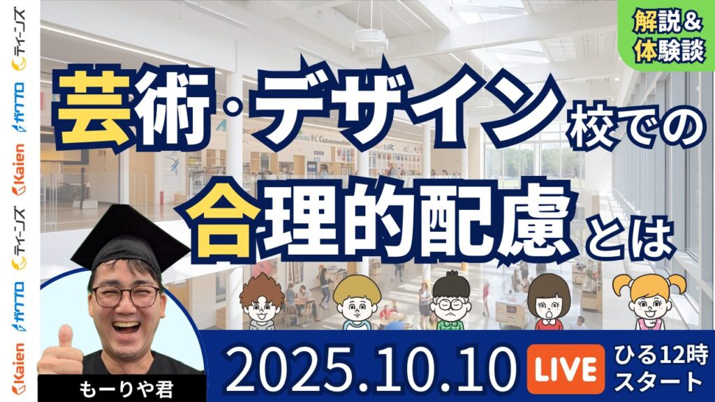 本日12時から、ティーンズ公式YouTubeチャンネルで昼ライブを配信予定です!今回は、芸術・デザイン系高校に通うティーンズ生の保護者様をゲストにお迎えいたします。受験時や入学後の合理的配慮の活用について、リアルな声をお届け!