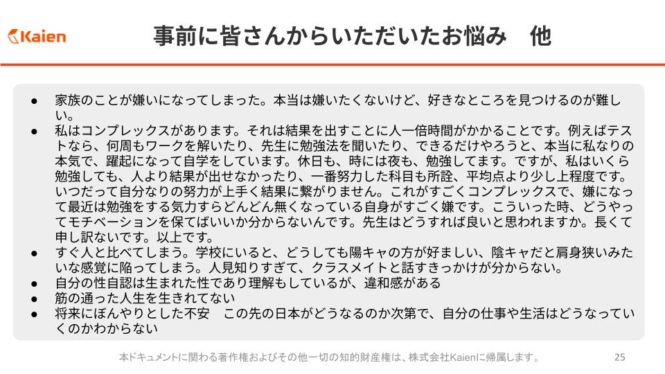 事前に生徒の皆さんに「今悩んでいることはありますか?」というアンケートを実施したところ、非常に率直な声が寄せられました。