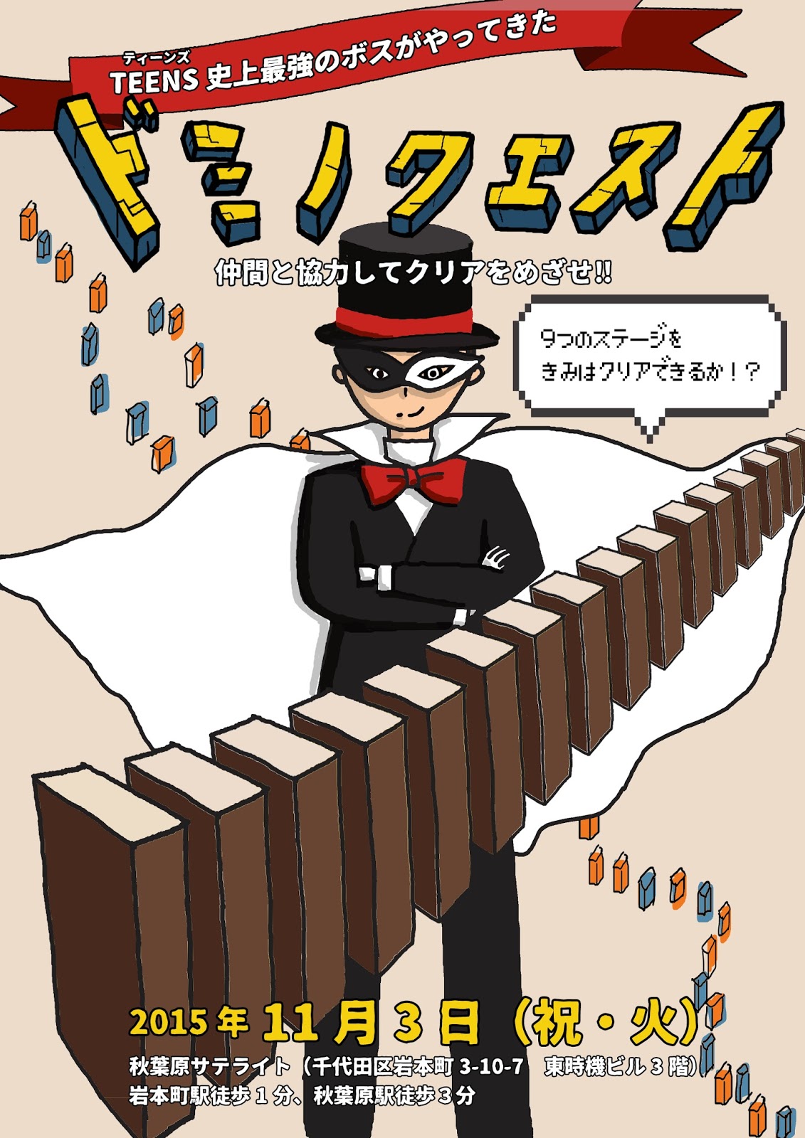 TEENSでは、平日の学習支援や週末のお仕事体験の他に年に4回程度お子様向けにイベントを開催しています。これまで冬に『cafe TEENS』や夏に『ペンションTEENS』などを実施してきましたが、今回秋のイベントとして11月3日(祝・火)にTEENS新宿・横浜・御茶ノ水合同で『ドミノクエスト』実施いたします。
