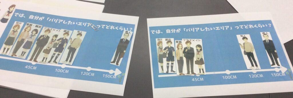 次に、人間関係において非常に重要な「距離感」のワークです。「腕一本分」という具体的な指標をもとに、相手との関係性によってどれくらいの距離が心地よいかを考えました。 「家族以外とは1.5m以上離れたい」と慎重に考えるお子さんや、自分の理想の距離感をワークシートに表現してくれるお子さんも。相手との関係や状況によって、適切な距離が変わることをみんなで確認しました。
