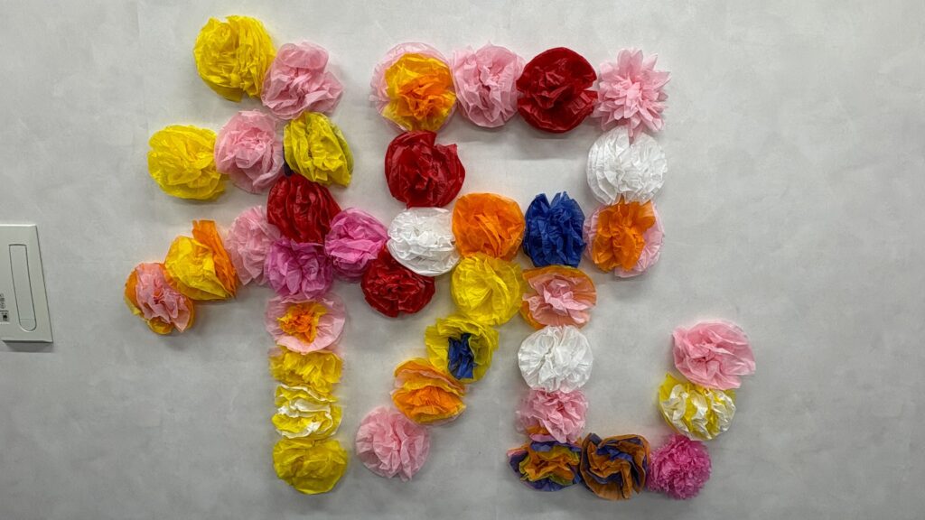 週末お仕事体験でお子さんが作ってくださったお花紙や折り紙の飾りなどをたくさん貼って、華やかに仕上げました!
